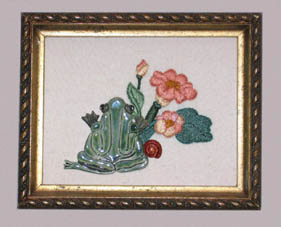 Bild gestickt"Frosch mit Blume"Frosch aus Porzellan mit gesticktem Blumenmotiv